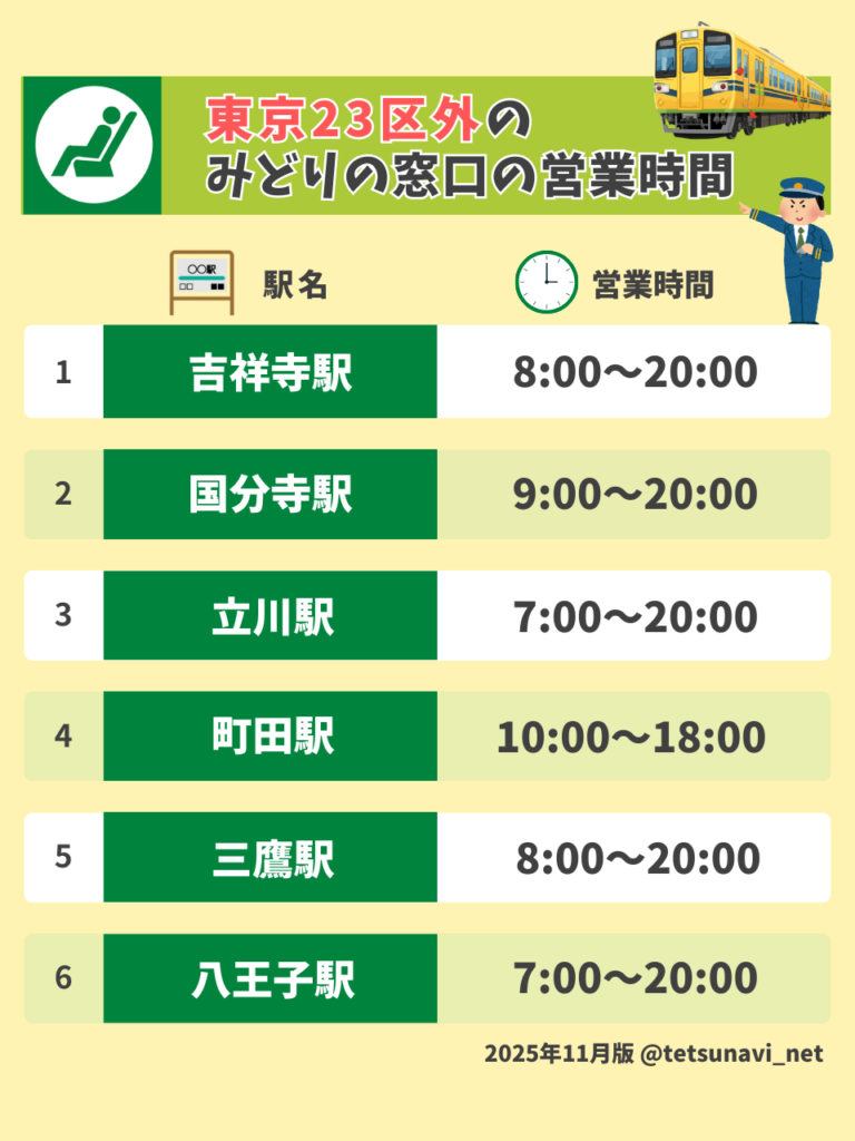 東京都23区外でみどりの窓口がある6駅について、営業時間をまとめました。
